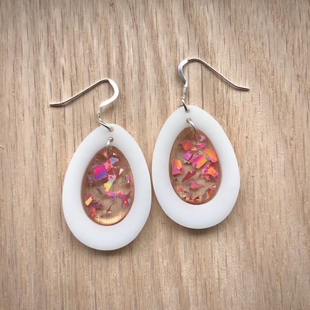These are fun, Easter-inspired dangles! Set in silver wire, these sparkling pink and white acrylic earrings with will dazzle!